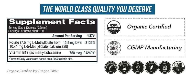 Organic L-Methylfolate 7.5mg + Methyl B12 | Liquid Sublingual Formula